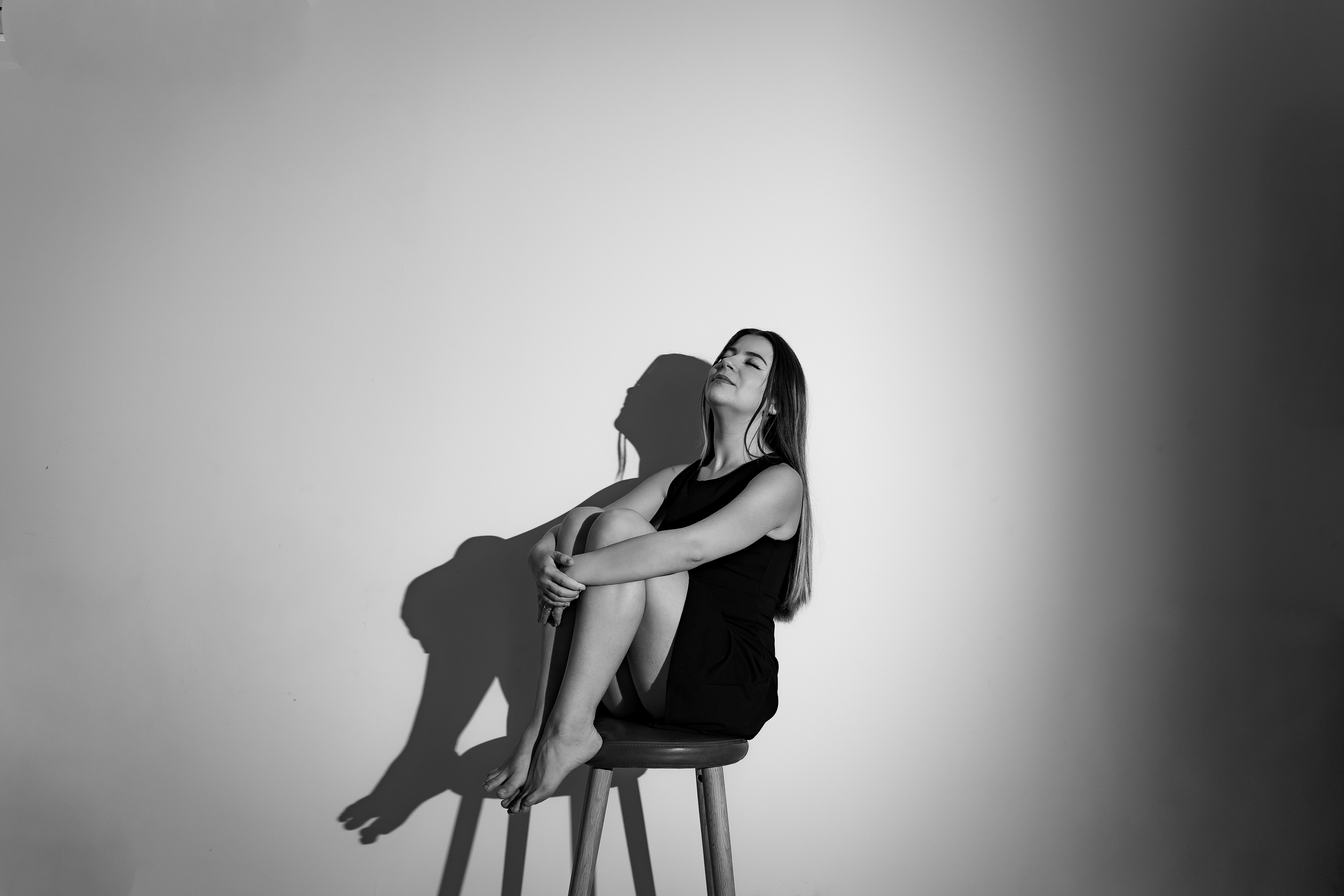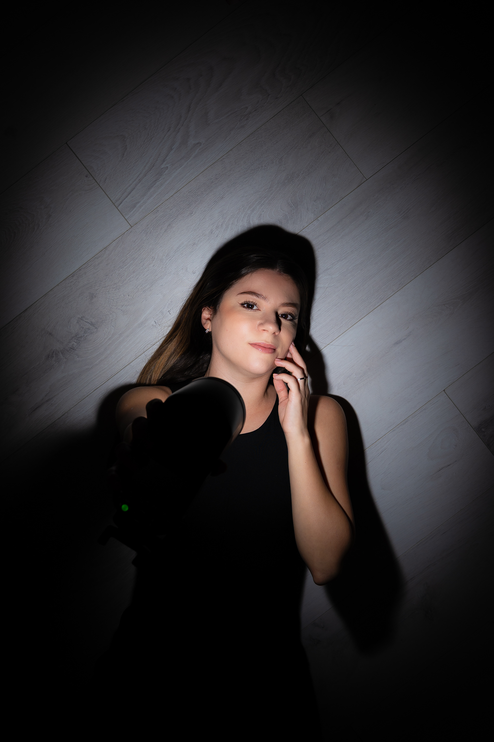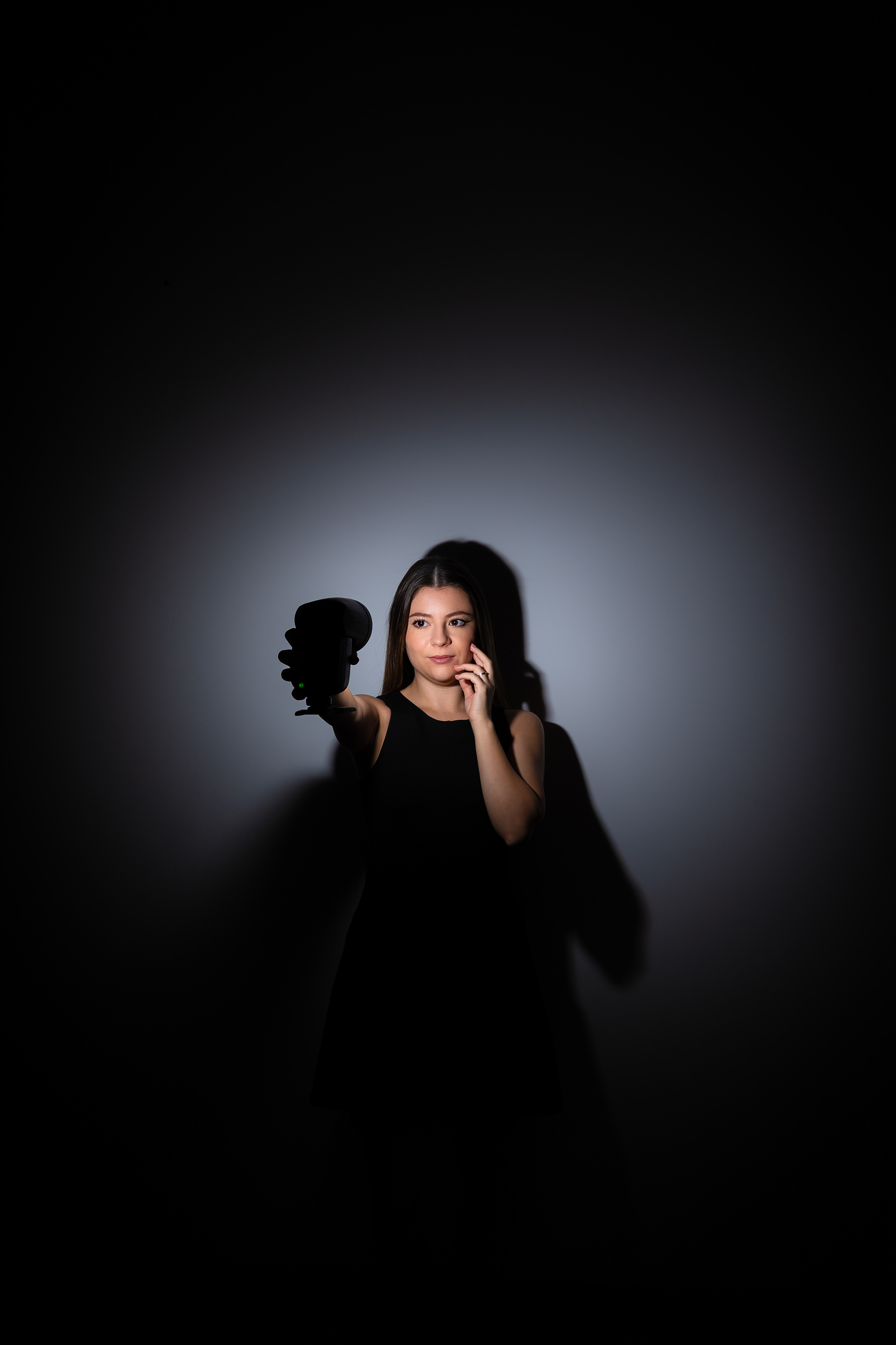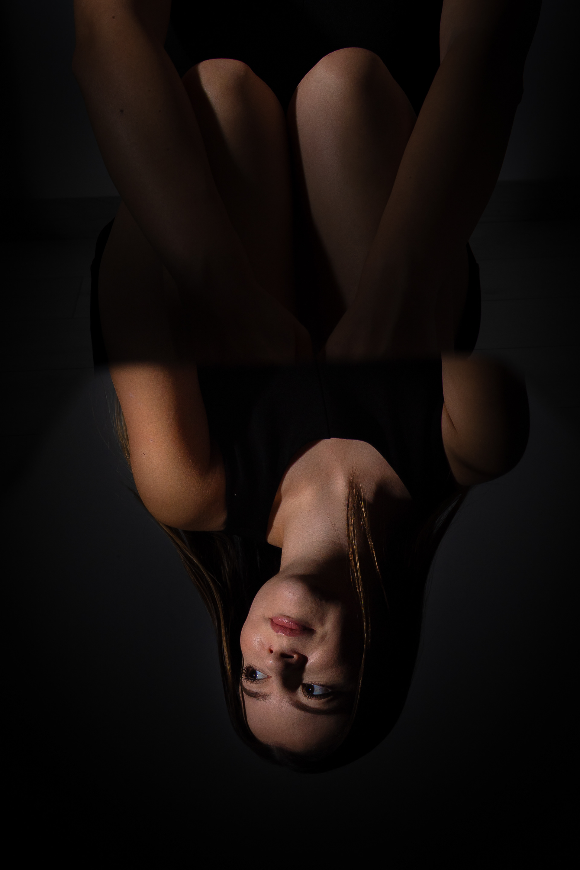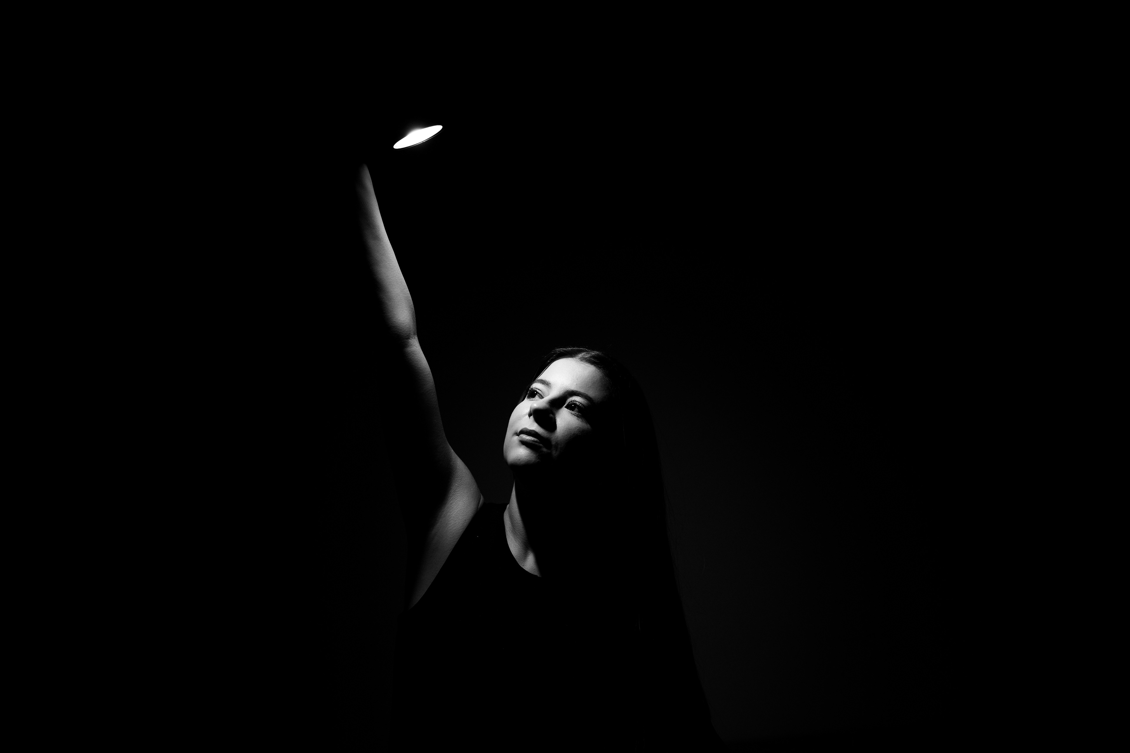 Am urmarit fotografia de portret minimalista, realizata în studio, punand accent pe jocul de umbre si pe expresivitatea naturala a modelului, folosind o schema de iluminare dramatica